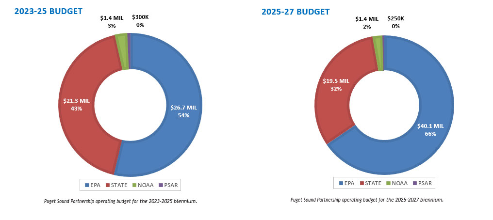 For the 2025-27 biennium the State Legislature has so far appropriated $19.5 million in state funds to the Partnership’s operating budget, including $700,000 in continued funding for the Quiet Sound Program, and the Partnership has budgeted $40.1 million in federal U.S. EPA funds. The Partnership also received $1.4 million NOAA PCSRF funds and $250,000 PSAR program funds. The Partnership was able to carry forward unspent PSAR program funds into the 2025-27 biennium, which explains the increased size of the PSAR budget when compared to the 2023-25 biennium.