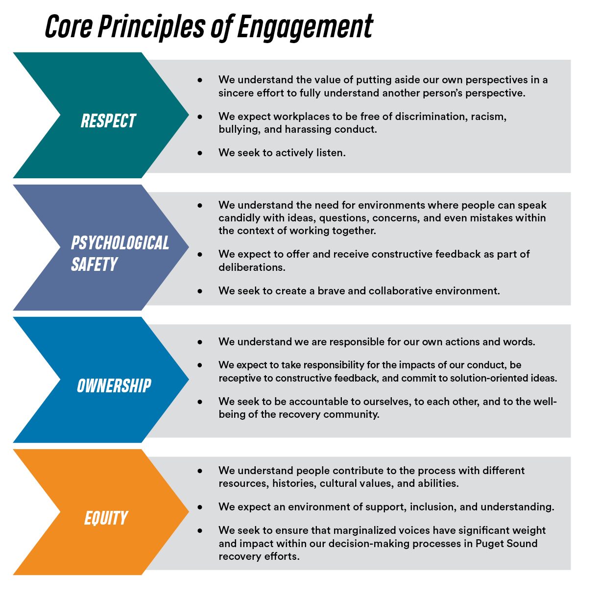 You can learn more about our Principles of Partner Respect Engagement on this page, or by downloading our PDF with a letter from Laura Bradstreet, executive director of the Puget Sound Partnership.