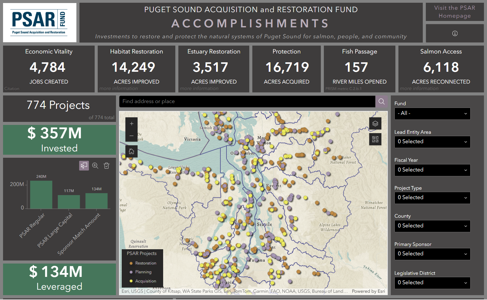 PSAR benefits ripple across local economies with 80% of the funds invested staying in the county where the projects are located. Community access, recreation, water quality, flood protection, food for orcas and much more also result from PSAR projects. To explore PSAR accomplishments and projects, view the dashboard here.